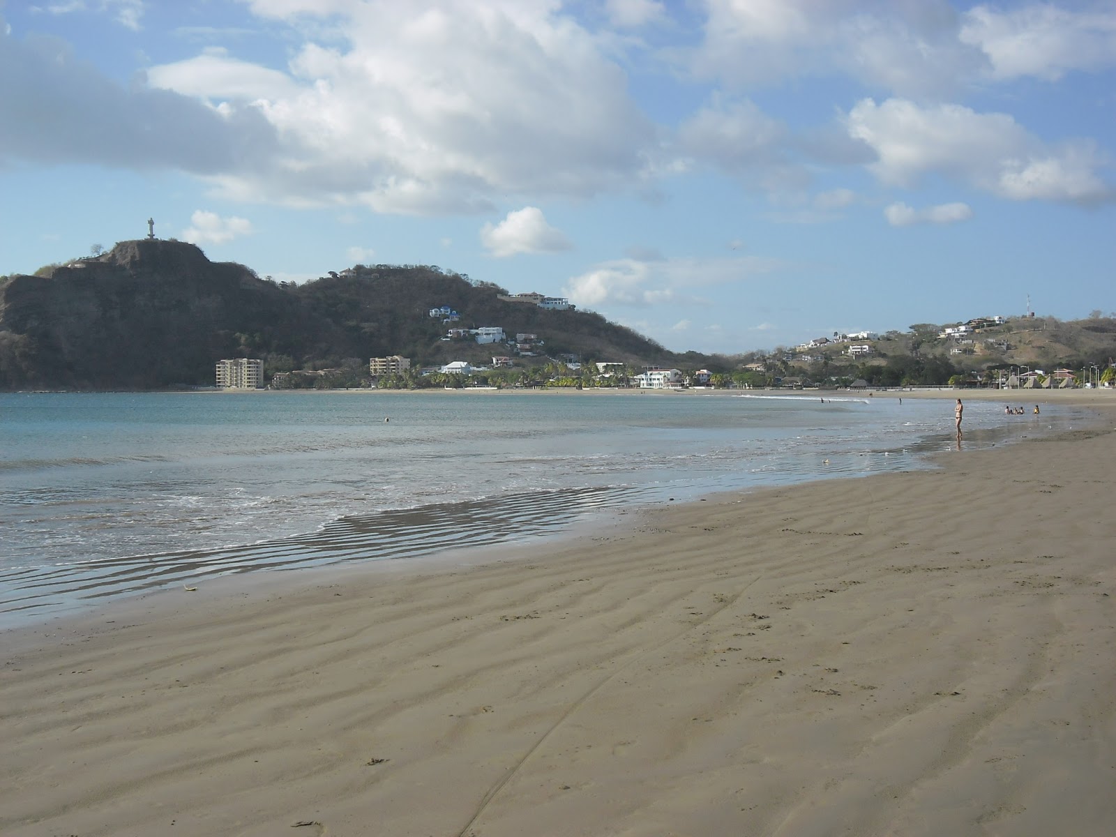 der lange Strand von San Juan del Sur mit Jesusstatue oben links |